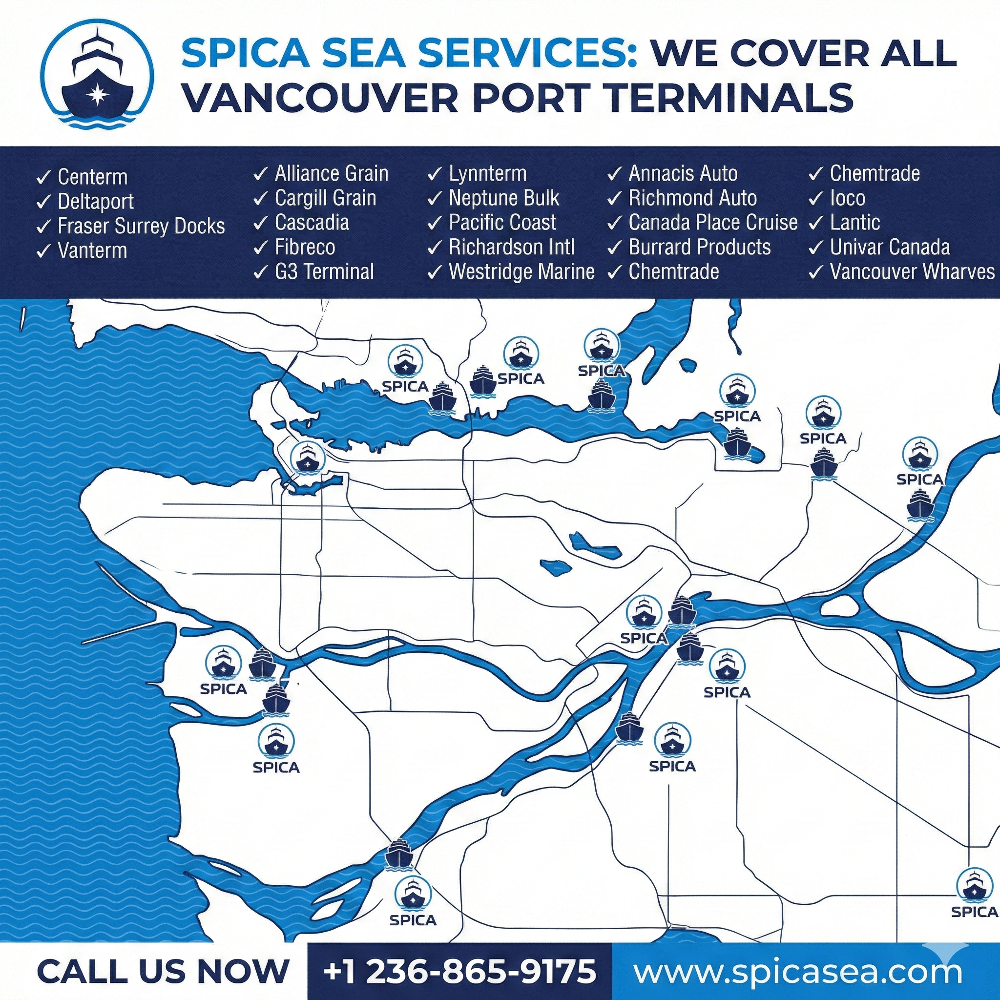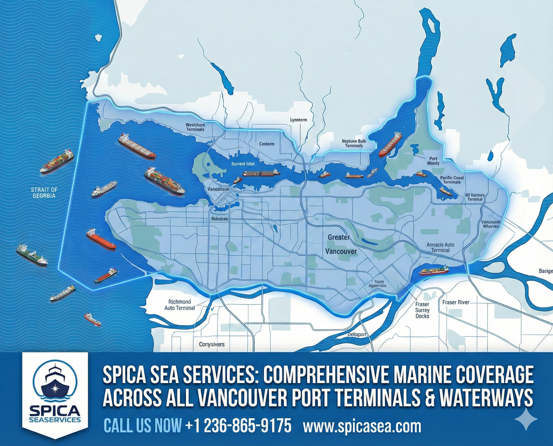 Spica Sea Services supports vessel calls throughout Vancouver and adjacent commercial port regions.
